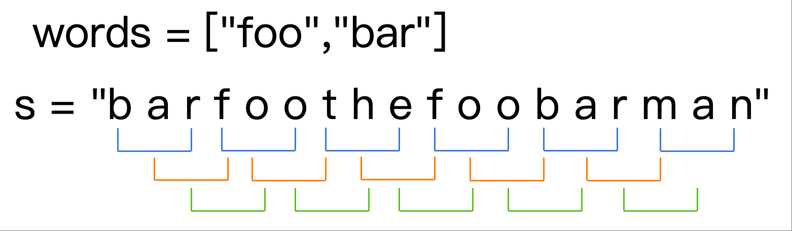 输入:s = “barfoothefoobarman”, words = [“foo”,“bar”]